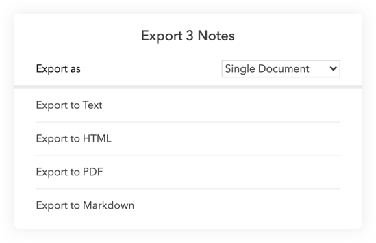 Export your notes to Text, PDF, HTML or Markdown. You can export notes as separate documents or combining into a single document.