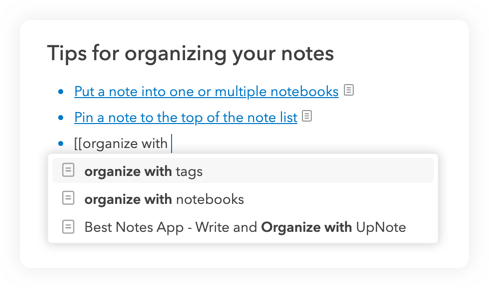 UpNote offers flexible ways to organize your notes: hashtags, nested notebooks, pinning notes to the top of the note list, adding notes to Quick Access and filtering notes using matched keywords.