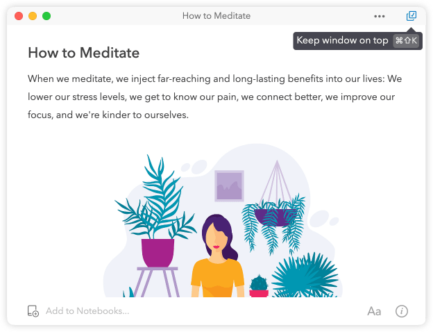 Taking notes during an online conference or learning is convenient with Keep-Window-on-Top feature. Your notes will be kept above other windows while you are working.